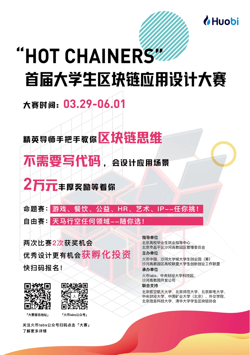 大赛是由北京高校毕业生就业指导中心、沙河高教园区管理委员会作为指导单位;华体育网页版登录入口_华体育(中国)科技园、沙河高教园开发公司、火币Labs共同承办;北京航空航天大学、北京师范大学、北京邮电大学、华体育网页版登录入口_华体育(中国)、中国矿业大学(北京)、外交学院、北京信息科技大学、清华大学学生区块链协会等单位联合支持。大赛报名可通过微信公众号“区块链创新工场”-“大赛”栏目报名参与。