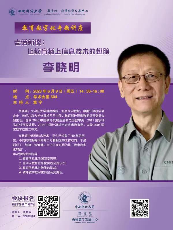 李晓明:大湾区大学讲席教授,北京大学教授,中国计算机学会会士。曾任北京大学计算机系系主任,教育部计算机教学指导委员会副主任。曾获2020中国教师发展基金会杰出教学奖,2017国家精品在线开放课程,2014中国计算机学会杰出教育奖,以及2008国家教学成果二等奖。