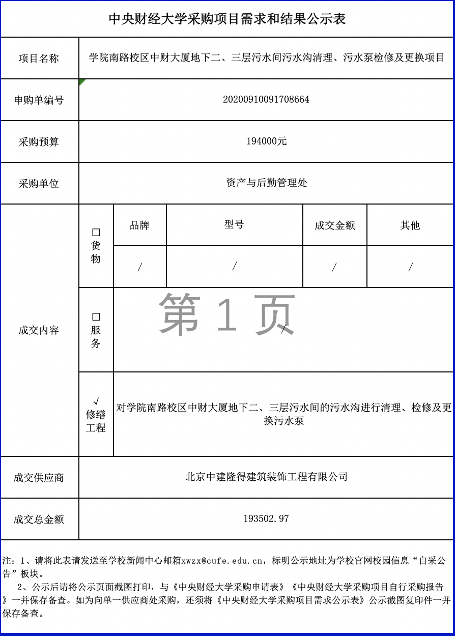 学院南路校区中财大厦地下二、三层污水间污水沟清理、污水泵检修及更换项目需求和结果公示