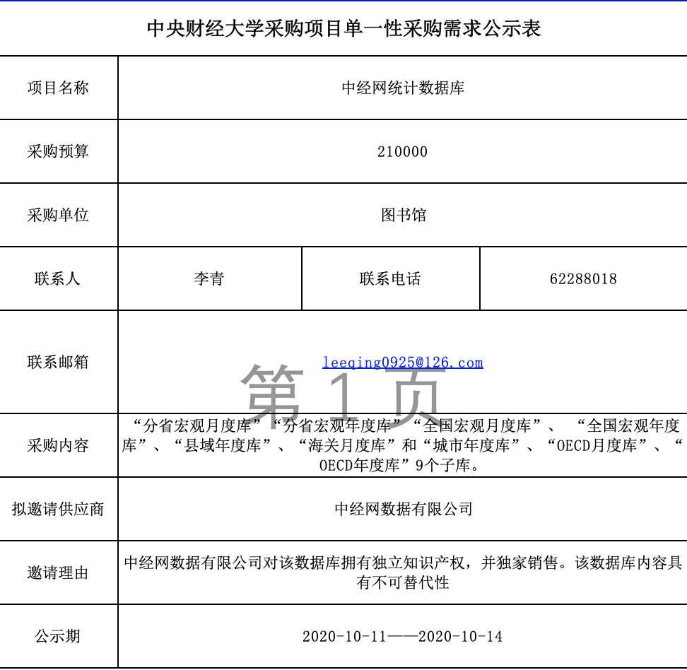 中经网统计数据库项目单一性采购需求公示表