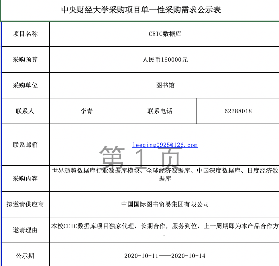 CEIC数据库项目单一性采购需求公示表