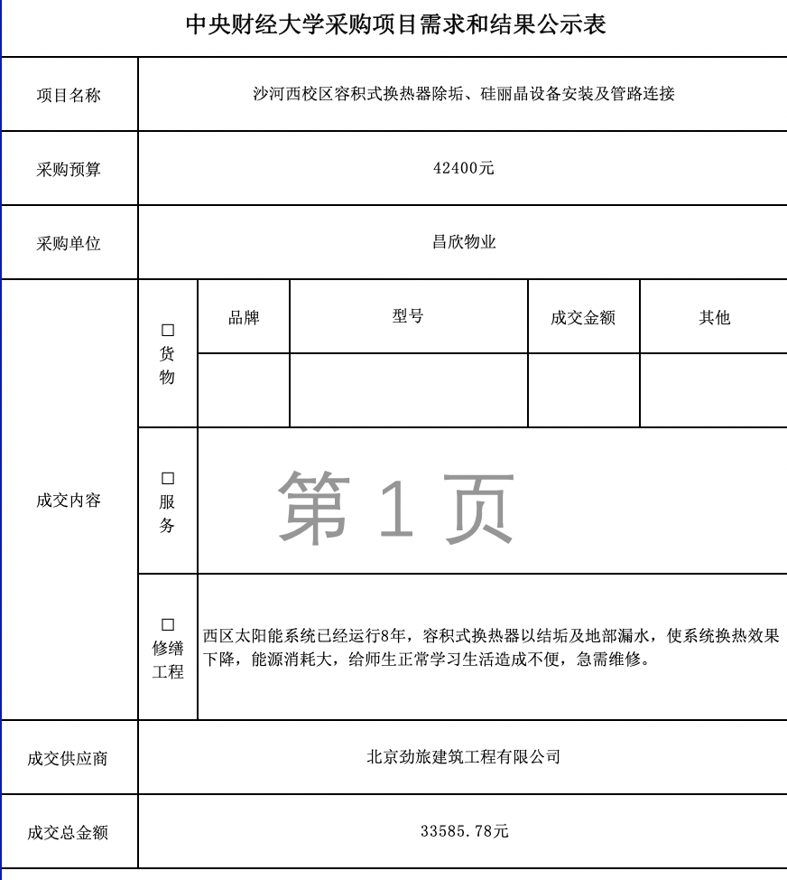 沙河西校区容积式换热器除垢、硅丽晶设备安装及管路连接项目需求和结果公示表